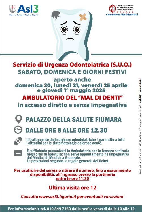 Si ricorda che durante i giorni festivi è attivo il Servizio di Urgenza Odontoiatrica presso il Palazzo della Salute della Fiumara.
